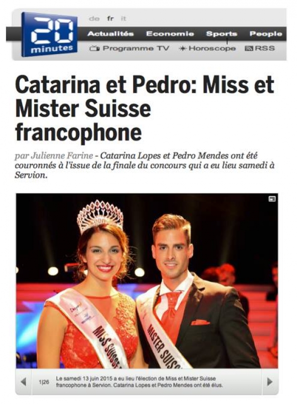 Elle est étudiante en dernière année à la Haute école de santé de Genève, il est électricien de réseau. Depuis samedi 13 juin 2015, Catarina et Pedro, 24 et 27 ans, sont aussi les représentants des francophones de Suisse dans le monde. Ils ont été élus Miss et Mister Suisse francophone, à ne pas confondre avec Miss et Mister Suisse romande, un concours différent.