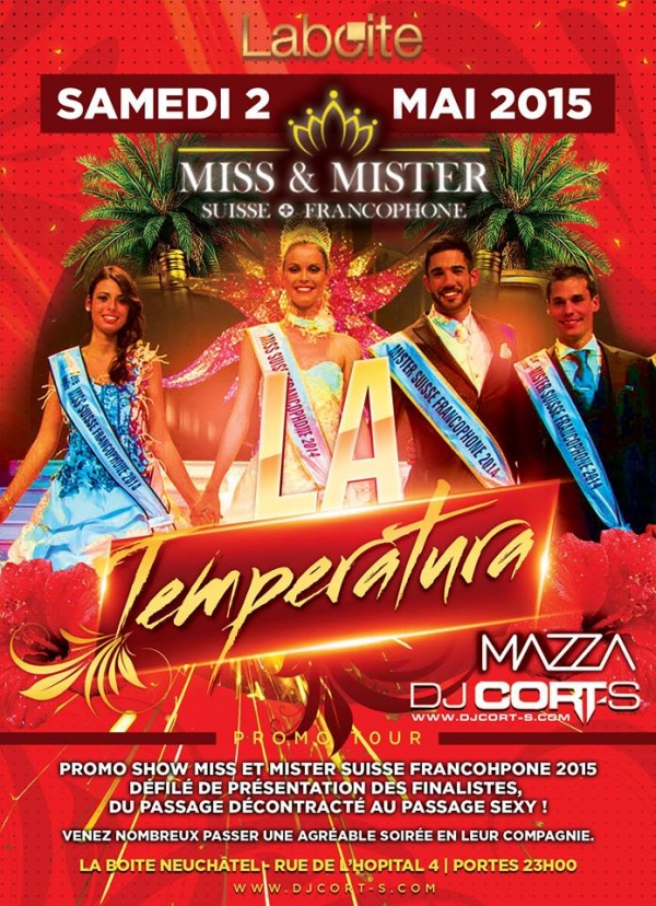 SAMEDI 2 MAI : LA TEMPERATURA !!! Nous acceuillerons les candidats MISS & MISTER SUISSES FRANCOPHONE, dans l’ambiance «CALIENTE» du club «LA BOITE» PRÉSENTATION DES FINALISTES & DÉFILÉ TENUE DÉCONTRACTÉE ET SEXY. ATTENTION! La temperatura va monter avec : DJ MAZZA et DJ CORT-S